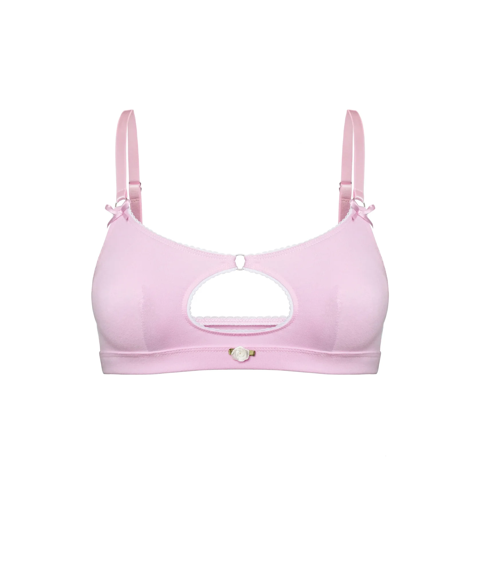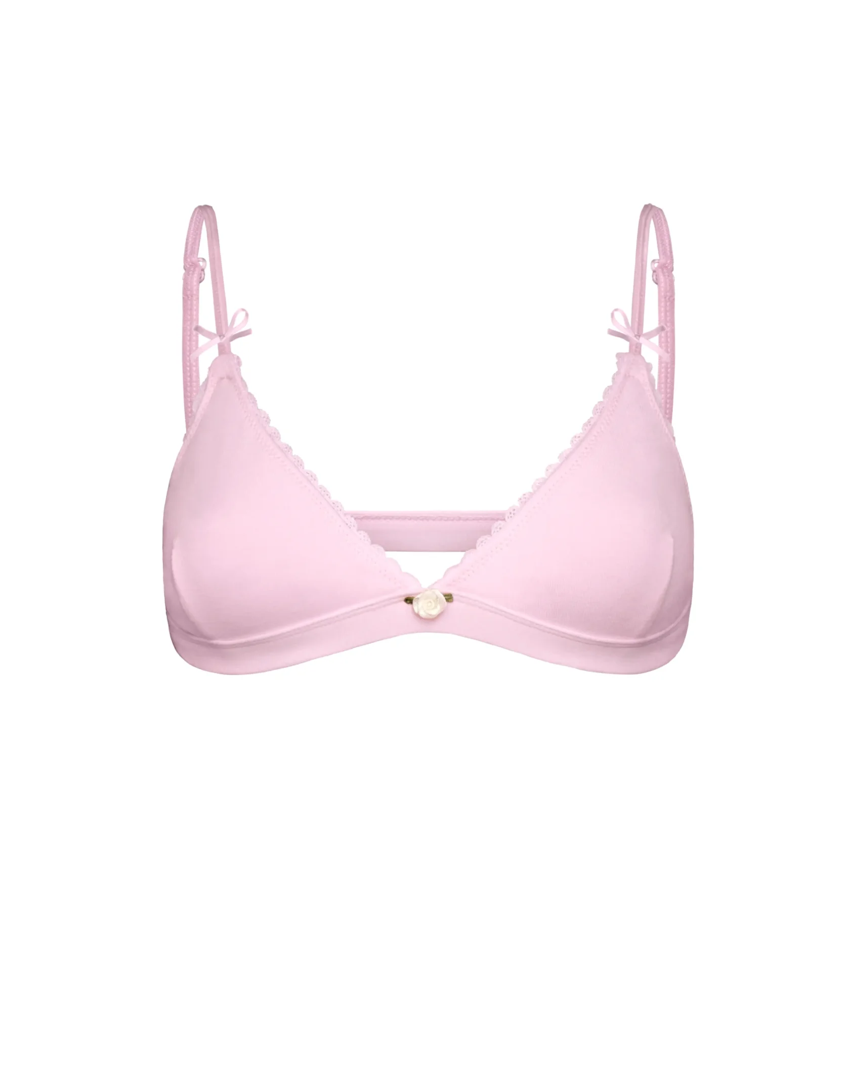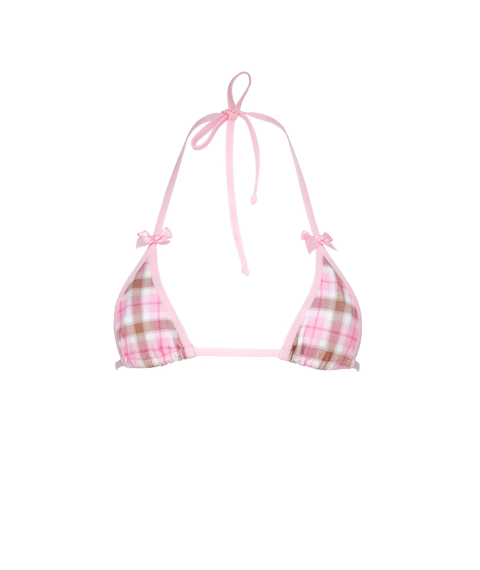 The Baby Pink bikini top features a skimpy triangle shape, our new print, and adjustable string ties that wrap around the neck and back to give you a custom fit. Pair the Baby Pink bikini top with the matching Baby Pink bikini bottom as the perfect tanning set.